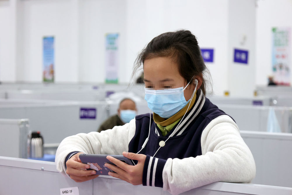 ↑4月19日,上海临港方舱医院,一名学生感染者通过手机上网课。