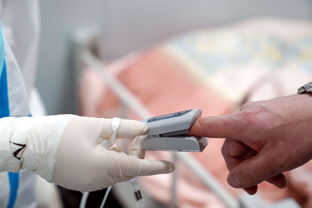 ↑4月21日,临港方舱医院的医护人员帮患者测量血氧饱和度。