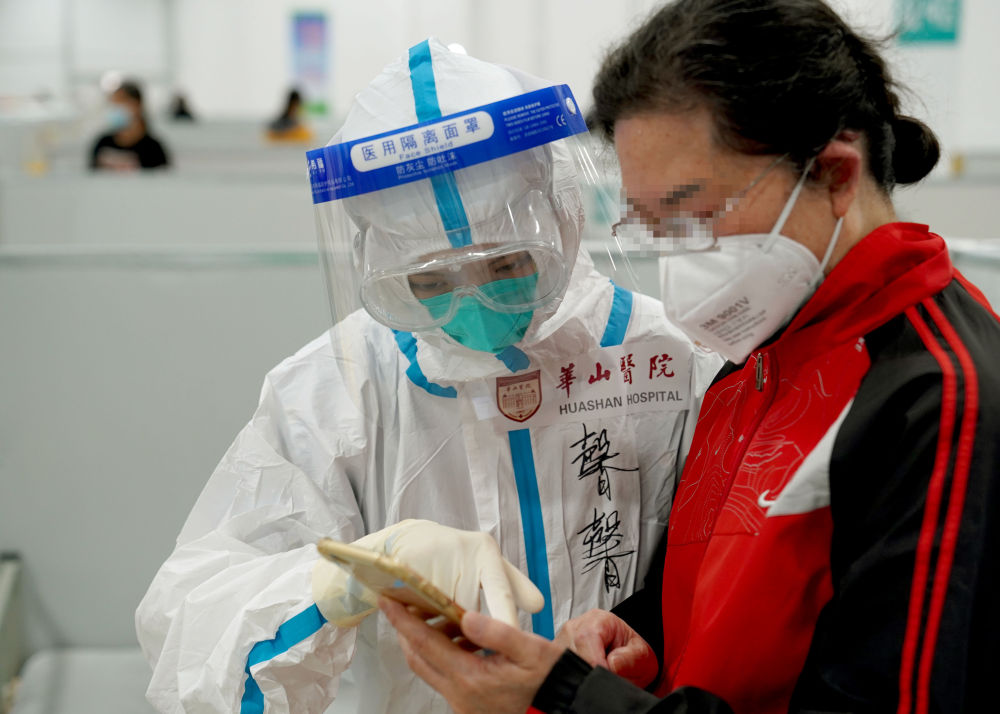 ↑4月23日,上海临港方舱医院的医护人员与老年患者交流。
