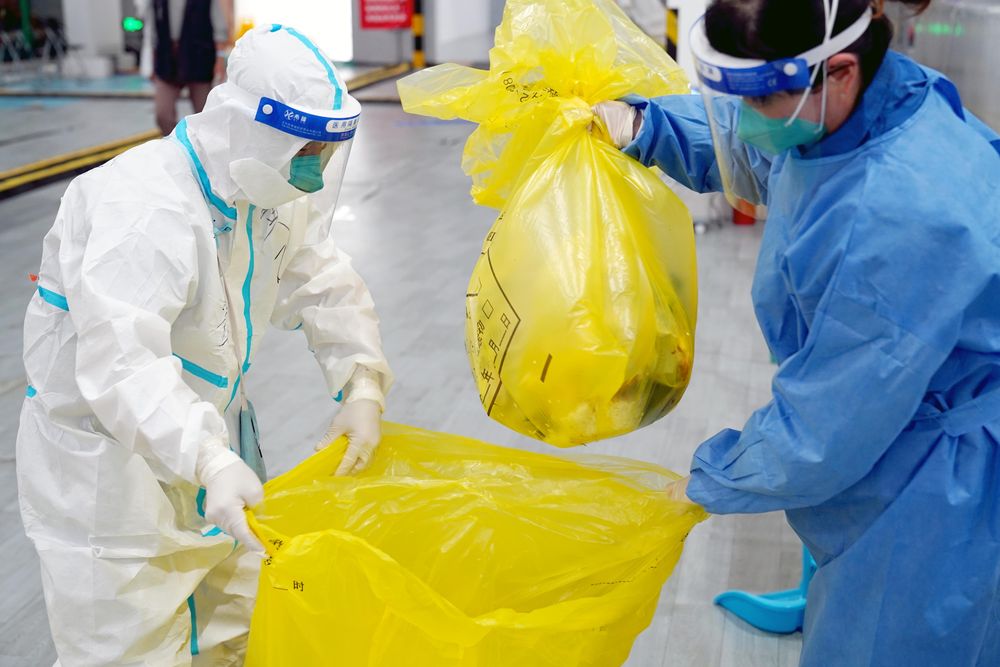 ↑4月28日,在临港方舱医院,一名保洁员和一名志愿者在清运生活垃圾。