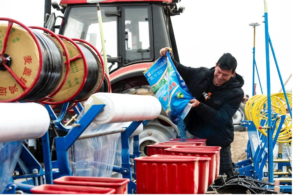 阿卜杜萨力·阿伍提往播种机里填装棉花种子(2021年3月26日 新华社记者马锴 摄)。