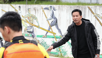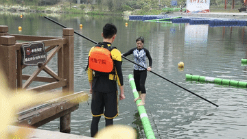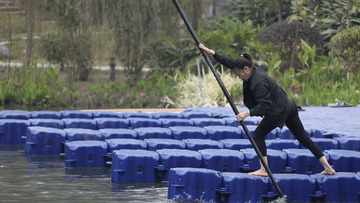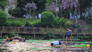运动员每天手握划杆站在竹竿上