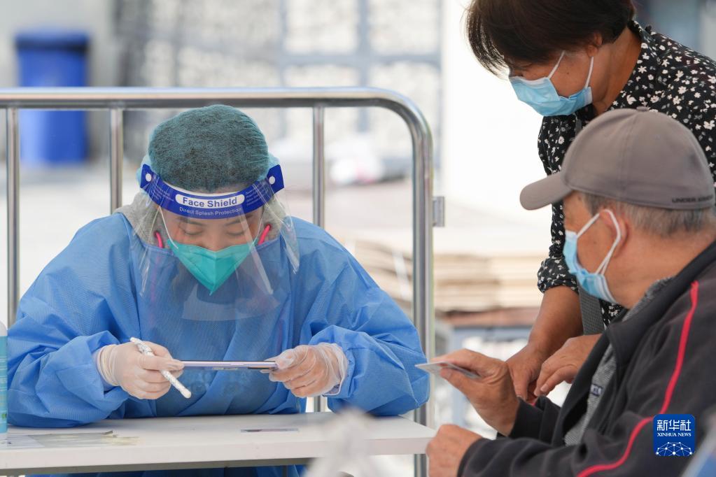 5月5日,在北京市东城区龙潭街道一处核酸检测点,志愿者为市民登记身份信息。