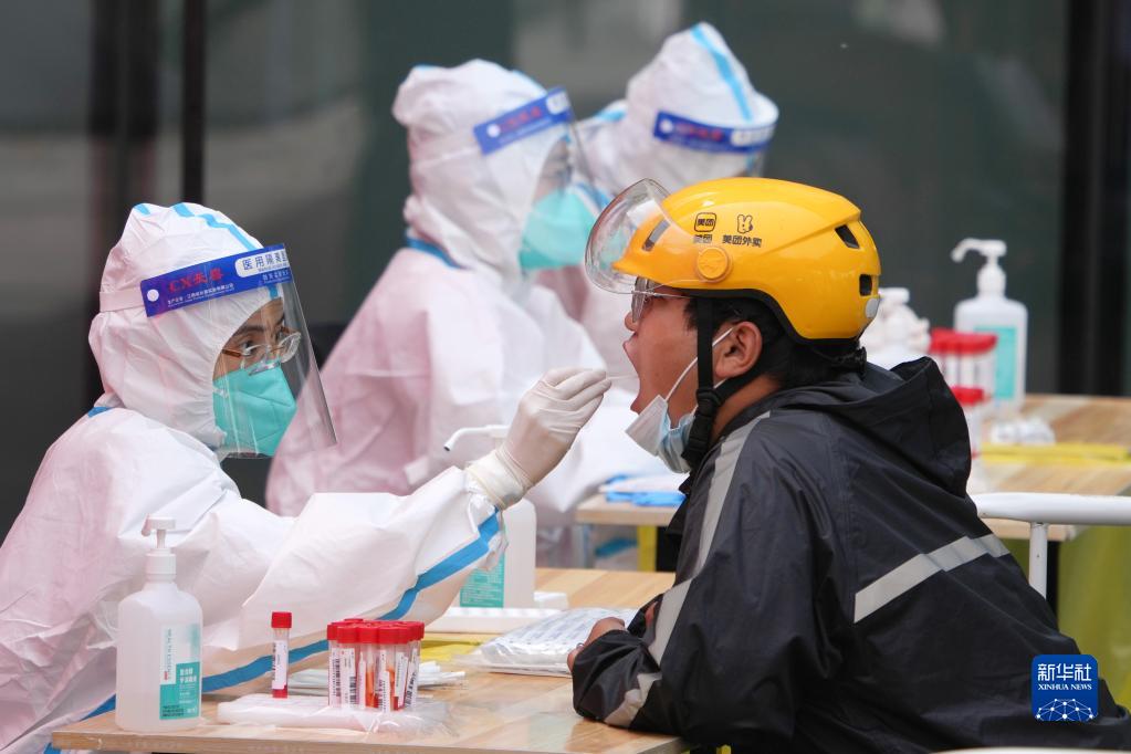 5月5日,在北京市朝阳区建外街道一处核酸检测点,来自北京安贞医院的医务人员(左)在进行核酸采样。