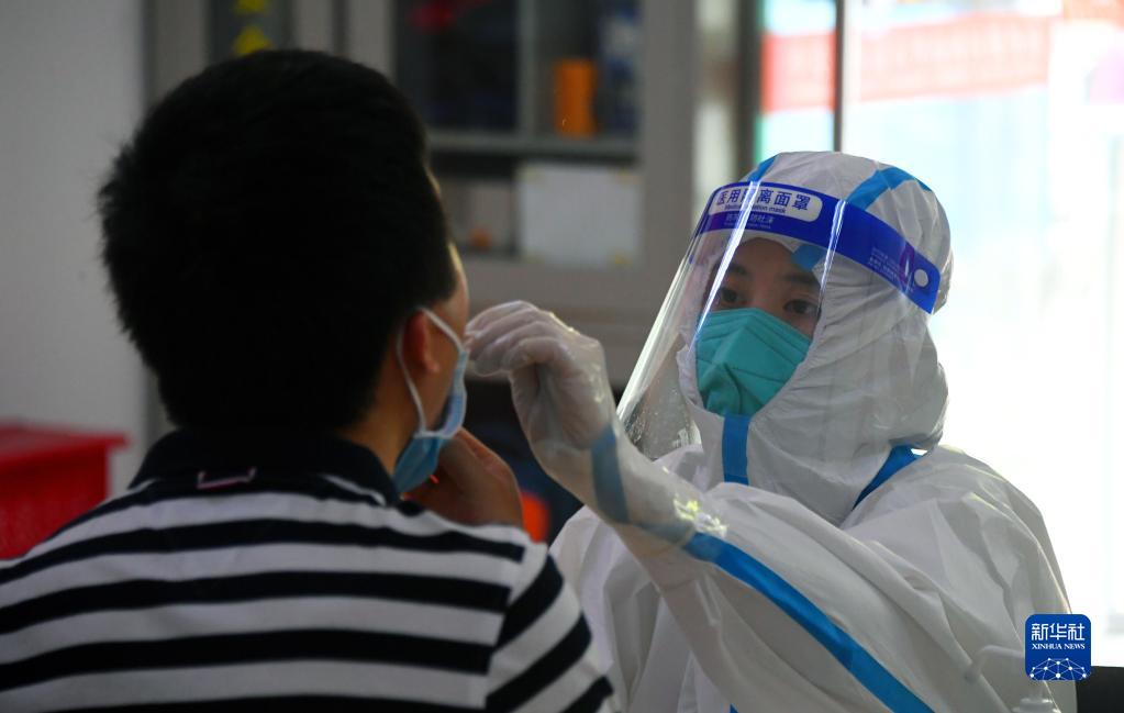 5月5日,在北京市海淀区中关村街道东里南社区临时核酸检测采样点,医务人员(右)进行核酸采样。