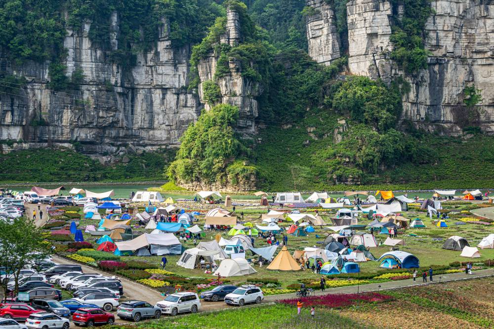 5月2日,人们在重庆市南川区万卷书台景区露营游玩。(新华社发)
