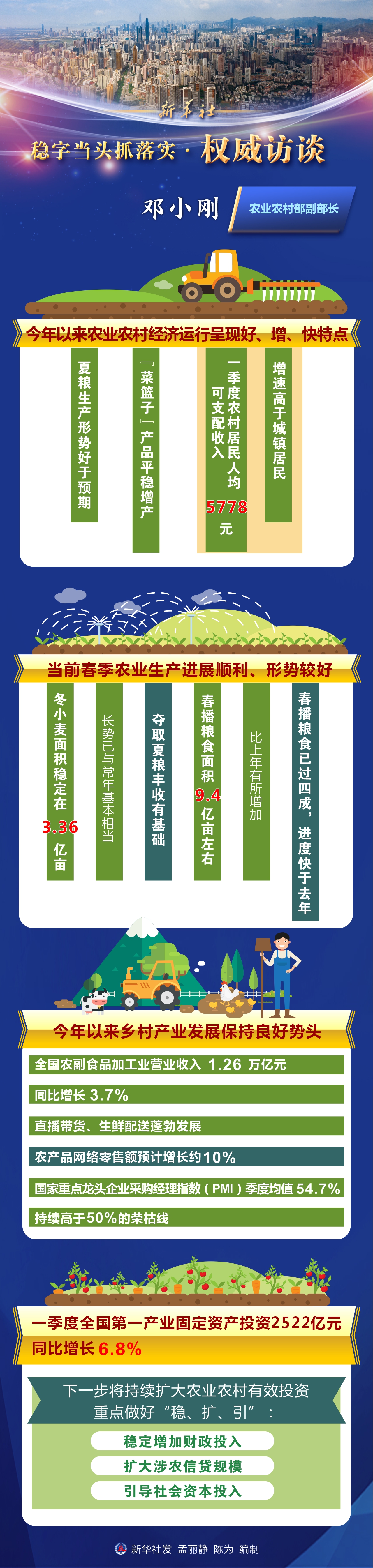 农业农村经济运行呈现好、增、快的特点:夏粮生产形势好于预期,“菜篮子”产品平稳增产,一季度农村居民人均可支配收入5778元,增速高于城镇居民,脱贫地区农民收入增速继续快于全国农村平均水平。下一步,我们将扎实推进乡村振兴各项重点任务,为经济社会大局稳定提供坚实支撑。