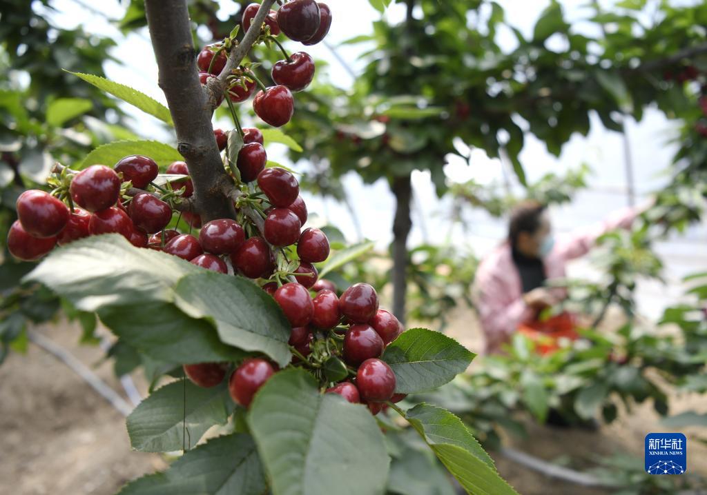 这是游客在承德市双滦区大贵口村村边的一栋大棚内采摘樱桃(4月13日摄)。新华社记者 杨世尧 摄