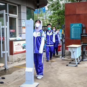5月6日,沈阳市铁路实验中学的学生在校门口测温后进入校园。(新华社发)