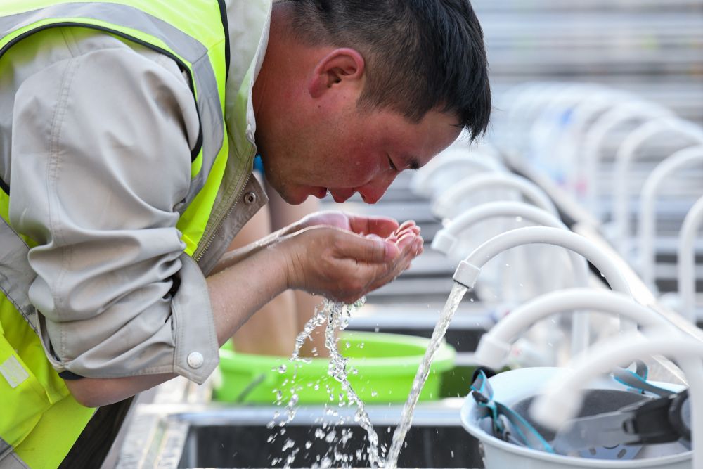 3月9日,临时用水接通。这是一名建设者用凉水给晒红的脸降温。