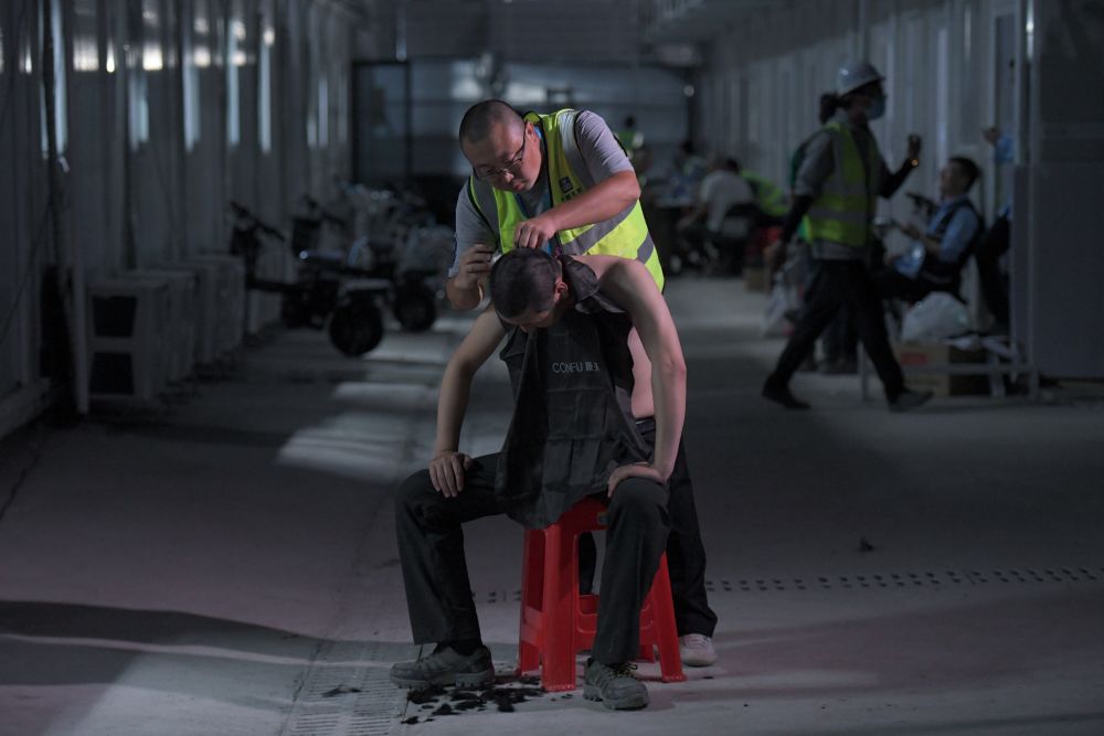 3月17日晚上,借着一点灯光,建设者互相帮忙理发。