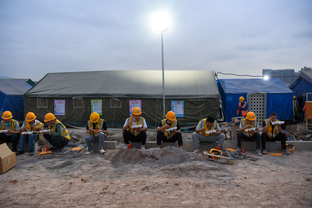 4月18日傍晚,工人们坐在帐篷外吃盒饭。