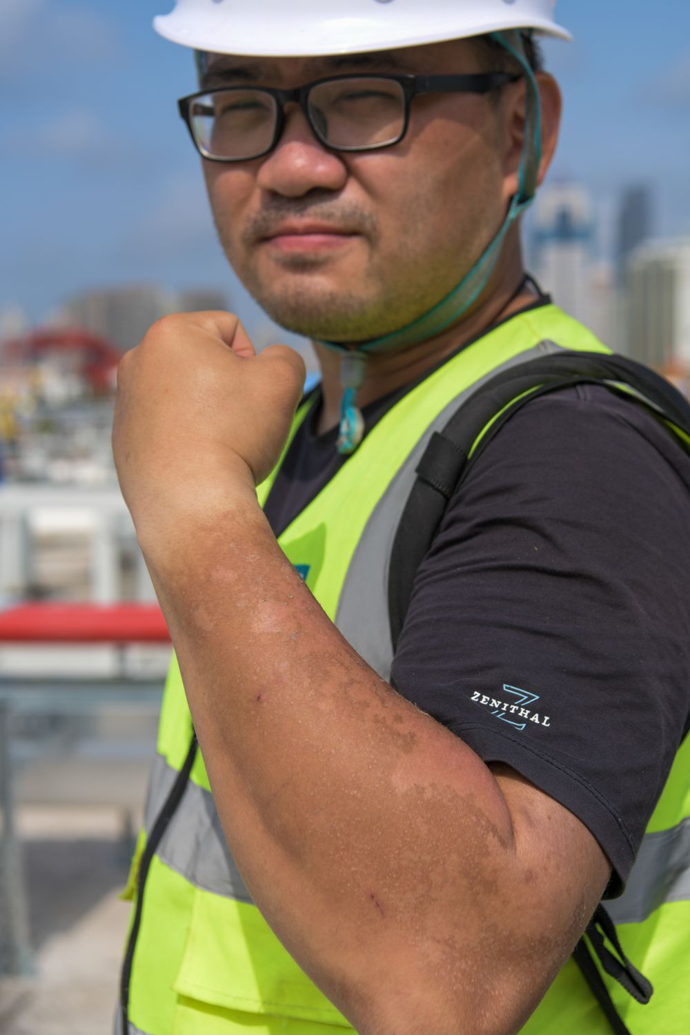 3月17日,一名建设者展示被暴晒脱皮的胳膊。