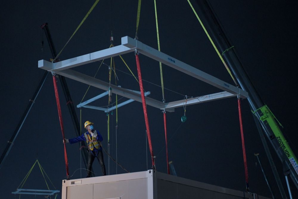 3月20日夜晚,一名工人在中央援港应急医院建设现场进行吊装作业。