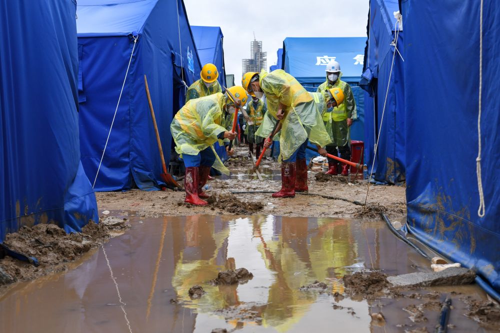 3月23日,一场大雨过后,泥水漫灌进生活区的帐篷,工人们动手挖排水渠。