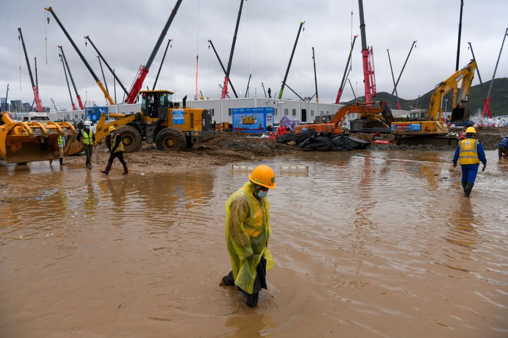 3月24日,连日阴雨,建设者们在工地上艰难行走。