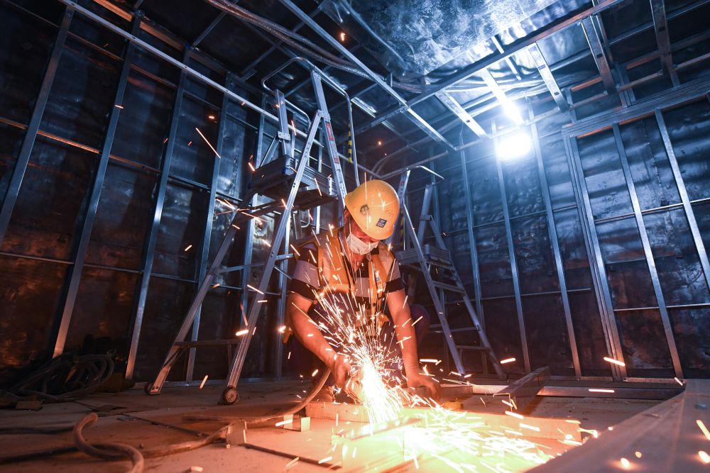 3月10日,应急医院建设工地,一名工人在搬运架空层钢支墩。