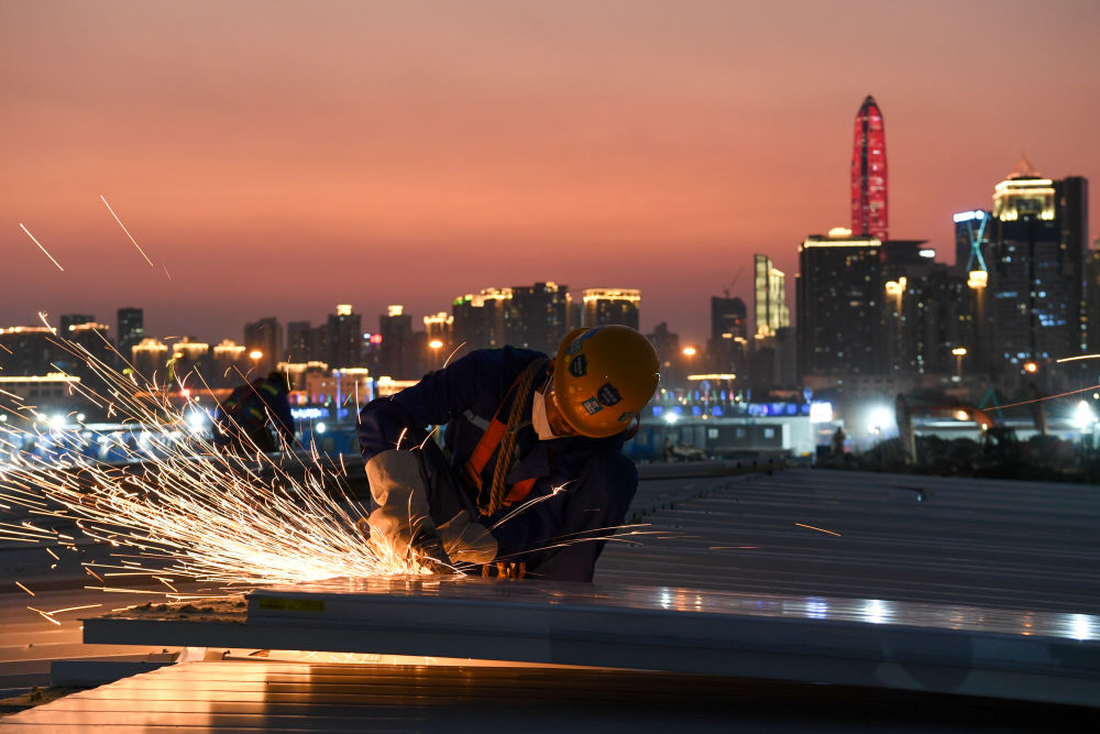 4月8日傍晚,一名工人在应急医院屋顶施工,他的身后是深圳万家灯火。