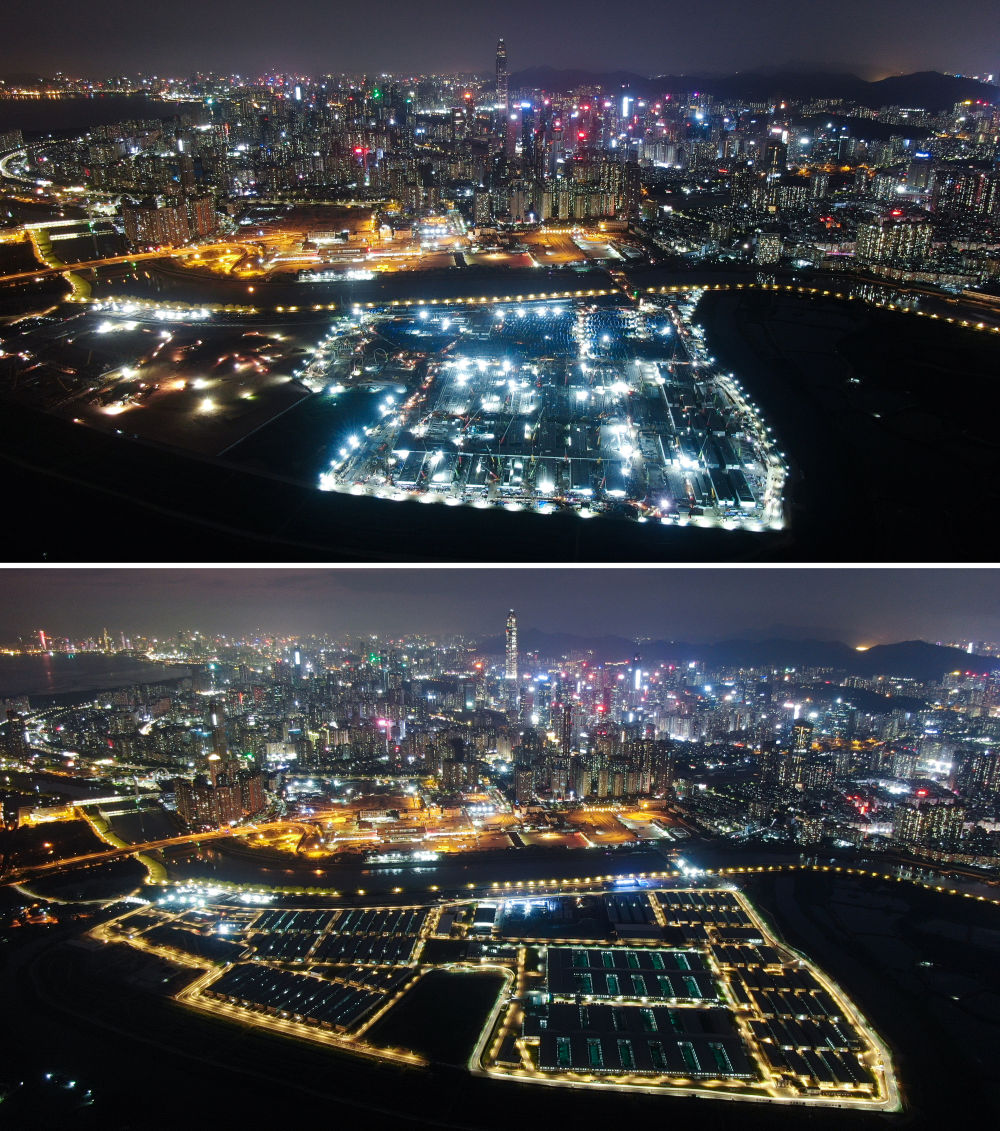 这是夜晚的中央援港应急医院建设中、完工后对比照片(上图拍摄于3月17日,下图拍摄于5月5日)。