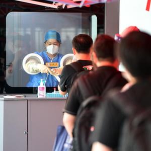 5月7日,工作人员在位于合肥南站的移动式核酸采样工作站里对出站旅客进行核酸采样。