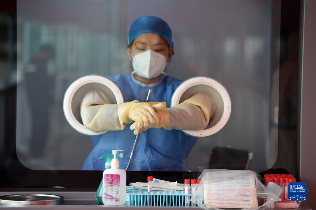 5月7日,在位于合肥南站的移动式核酸采样工作站,工作人员在核酸采样间隙对手套进行消毒。新华社记者 周牧 摄