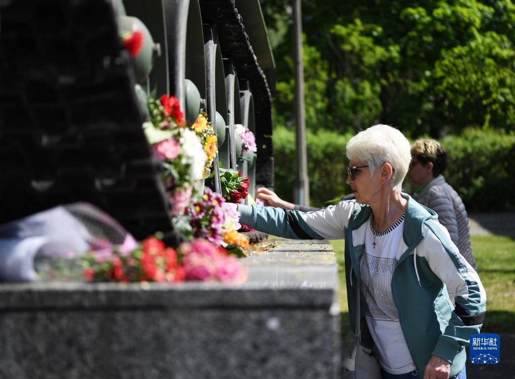 5月8日,在德国首都柏林的德俄博物馆,一名女子在一辆用于展览的坦克旁献花。当日是第二次世界大战“欧洲胜利日”,人们自发来到位于德国柏林东南部的德俄博物馆,纪念战胜德国法西斯77周年。新华社记者 任鹏飞 摄