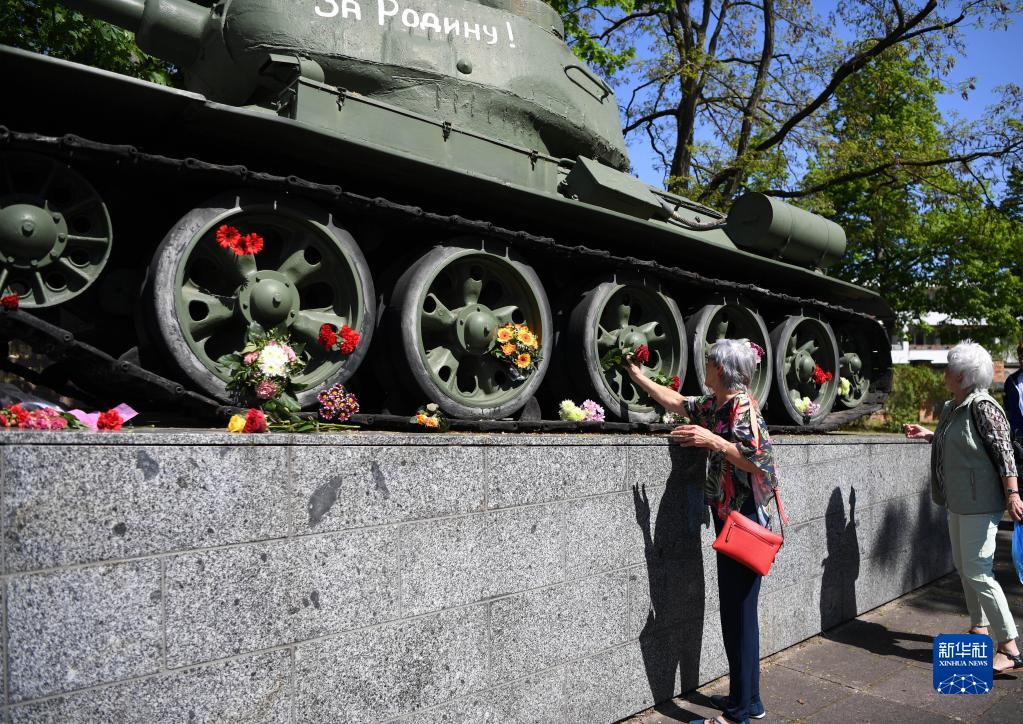 5月8日,在德国首都柏林的德俄博物馆,人们在一辆用于展览的坦克旁献花。新华社记者 任鹏飞 摄