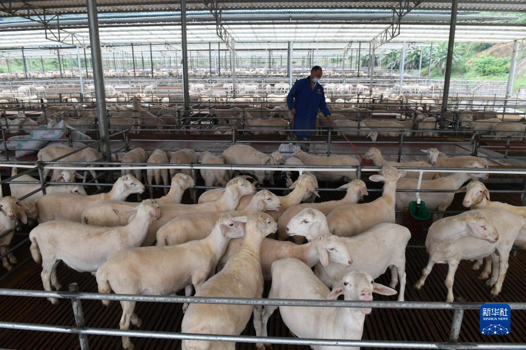 在广西东兰县武篆镇东里村澳寒羊养殖基地,工作人员在清理羊舍(5月6日摄)。