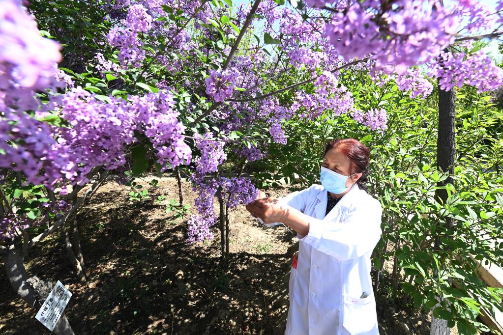 图为5月5日在西宁市林业科学研究所,所长张锦梅查看什锦丁香长势情况。新华社记者范培珅 摄