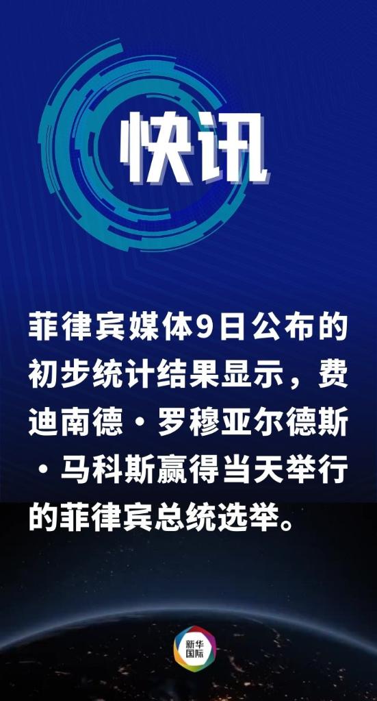 新华社快讯:菲律宾媒体9日公布的初步统计结果显示,费迪南德·罗穆亚尔德斯·马科斯赢得当天举行的菲律宾总统选举。