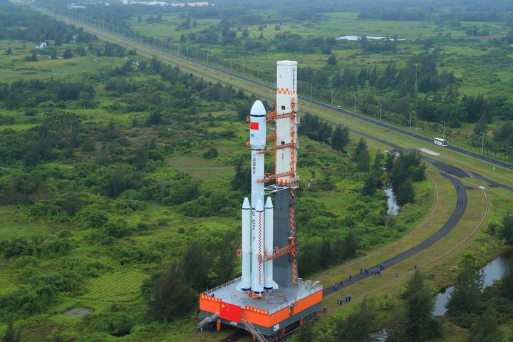 5月7日,天舟四号货运飞船与长征七号遥五运载火箭组合体在垂直转运。新华社发(杨志远 摄)