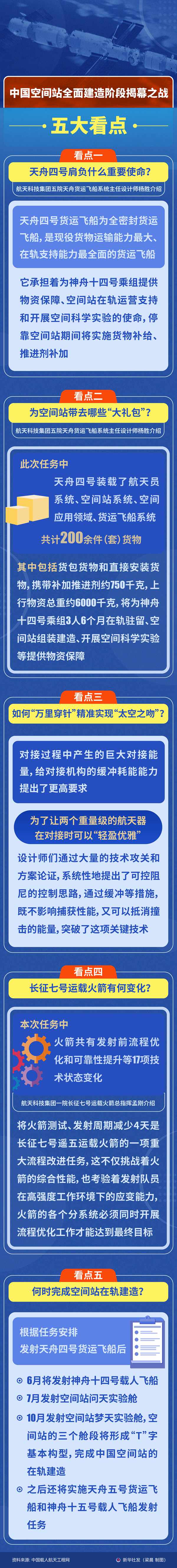 新华社北京5月10日电 题:天舟四号成功发射!中国空间站全面建造阶段揭幕之战五大看点