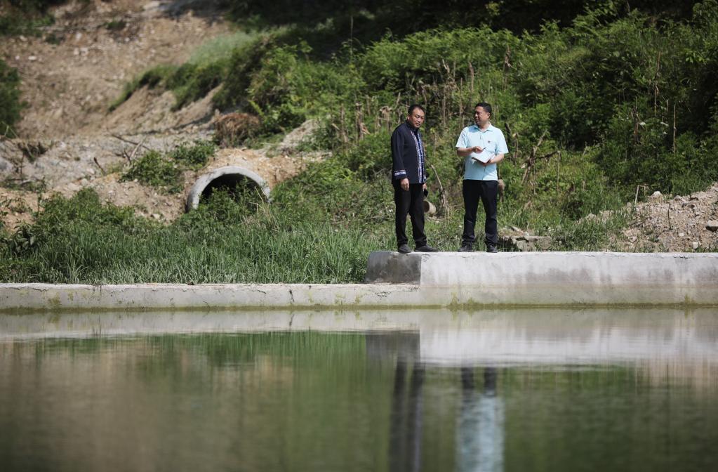 瓦窑村村支书王正华(左)和驻村第一书记彭强(右)检查山塘蓄水情况。 新华社记者潘德鑫 摄