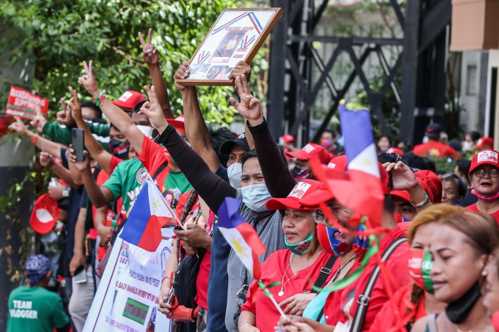 5月10日,在菲律宾曼达卢永,菲律宾联邦党候选人费迪南德·罗穆亚尔德斯·马科斯的支持者在初步统计结果公布后庆祝。新华社发(乌马利摄)