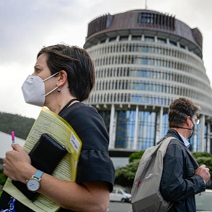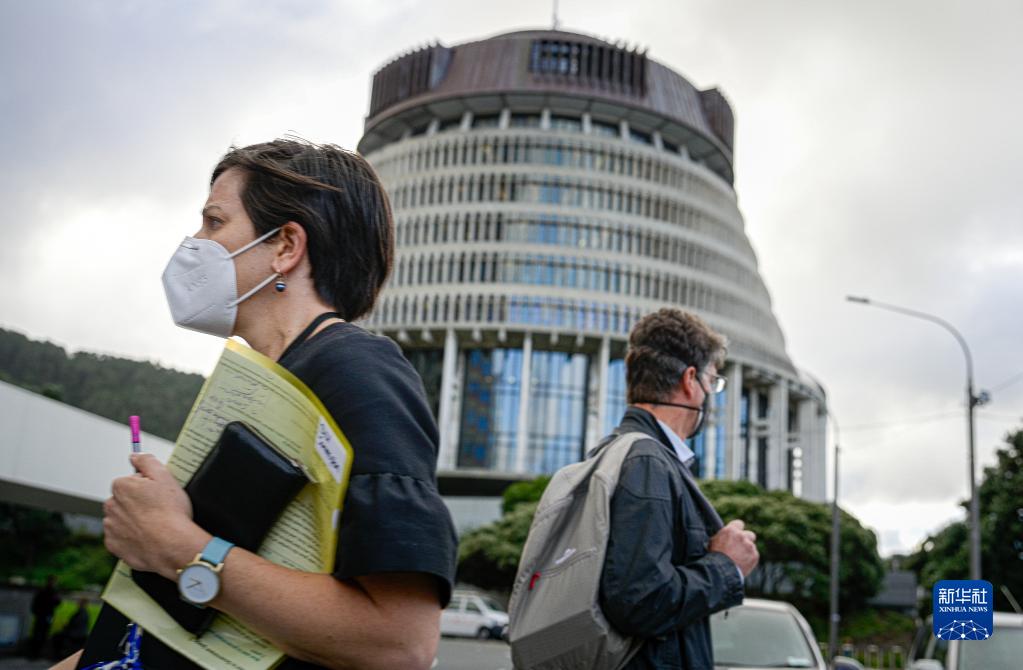 5月10日,在新西兰首都惠灵顿,戴口罩的行人经过国会大厦。