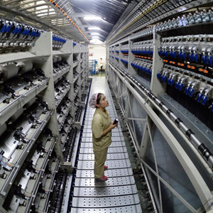 盛虹化纤自动化车间内,员工正在检查丝道。(受访者供图)