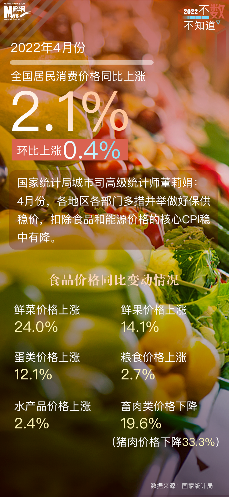 具体来看,4月份,因疫情期间物流成本上升,加上部分地方“囤货”需求增加,鲜菜、鲜果、鸡蛋和薯类价格同比分别上涨24%、14.1%、13.3%和11.8%,涨幅比上月均有扩大;随着生猪产能逐步调整、中央冻猪肉储备收储工作有序开展,猪肉价格同比降幅比上月收窄8.1个百分点。