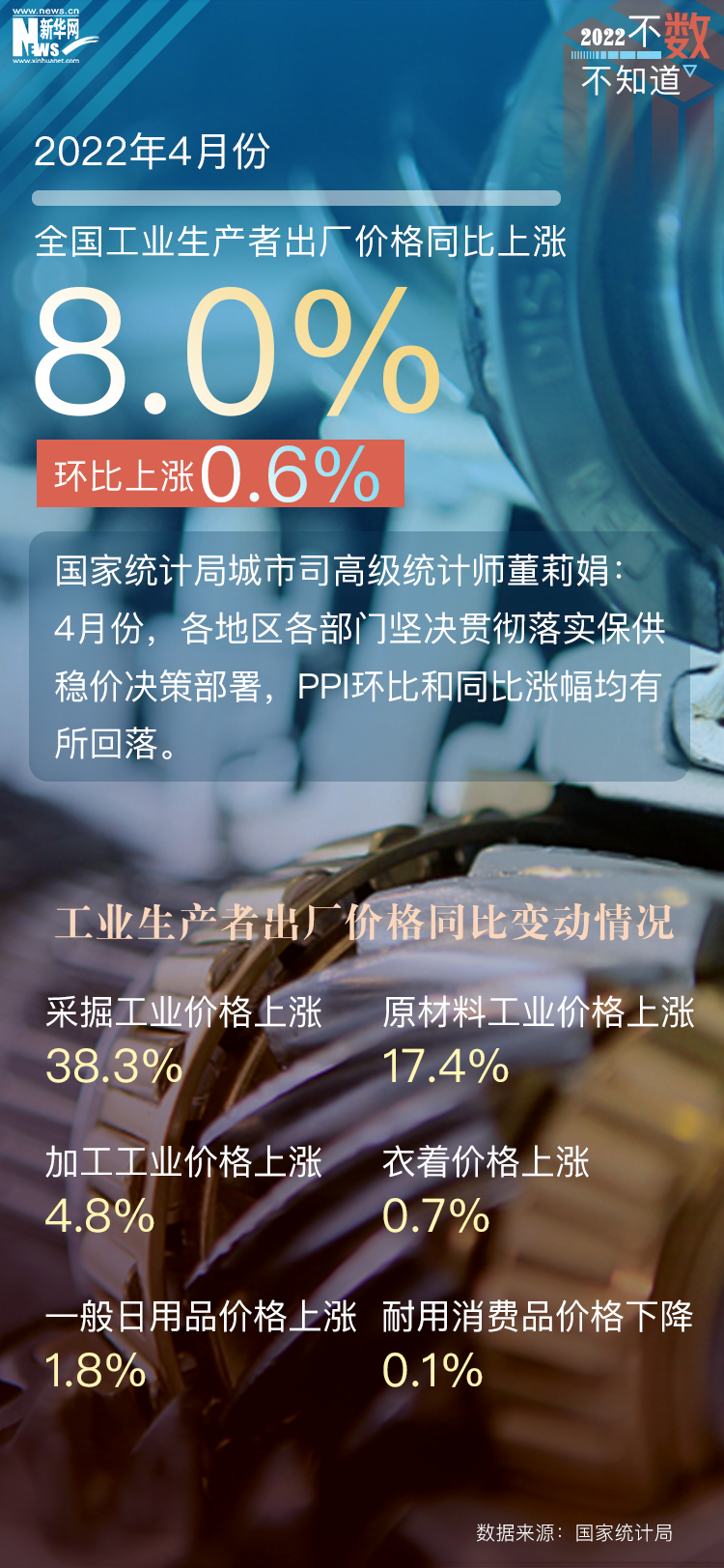 从全国工业生产者出厂价格指数(PPI)看,尽管国际大宗商品价格高位运行,但各地区各部门贯彻落实保供稳价决策部署,4月份PPI同比上涨8%,涨幅比上月回落0.3个百分点。