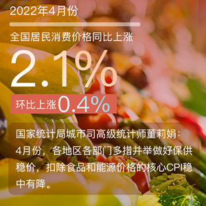 “4月份,在国际通胀水平居高不下的背景下,国内民生商品和大宗商品保供稳价效果持续显现,物价总水平继续运行在合理区间。”中国宏观经济研究院综合形势研究室主任郭丽岩说。