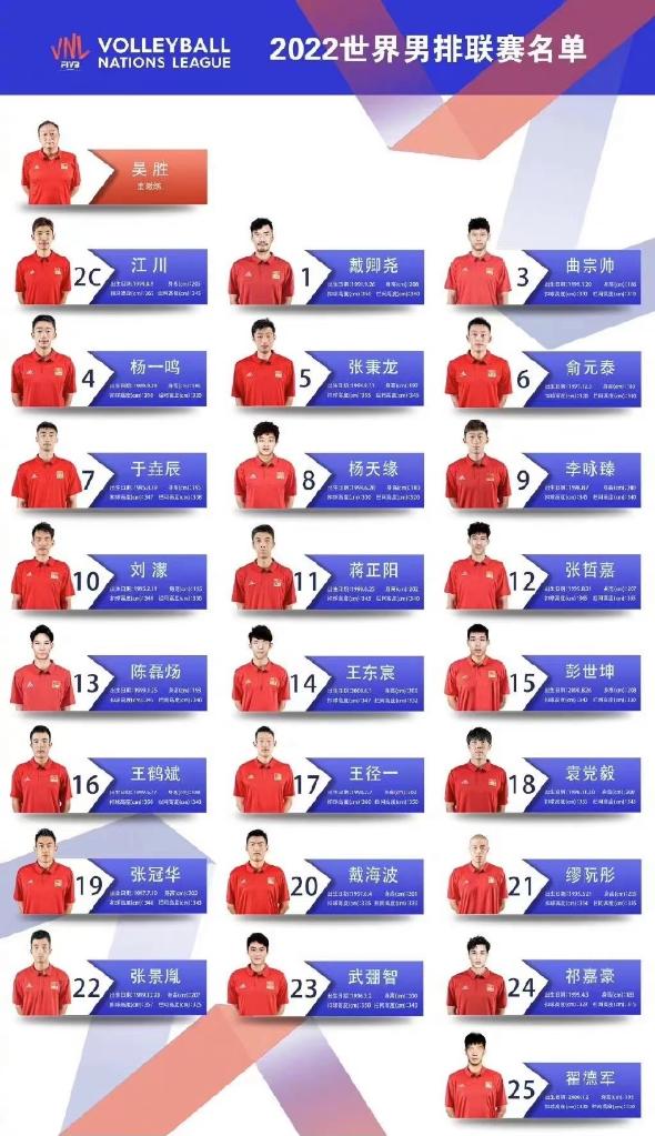 新华社北京5月12日电 国际排联11日公布了将在6月举行的2022年世界男排联赛(VNL)参赛名单,中国男排25人大名单出炉,江川、戴卿尧领衔。