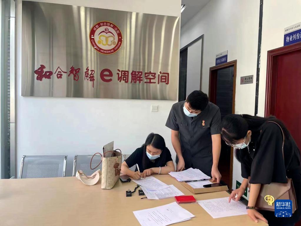 上海一家受疫情影响企业与成都一家房地产公司买卖合同纠纷诉前调解成功,法官组织当事人签署协议并出具司法确认裁定书(4月28日摄)。新华社发