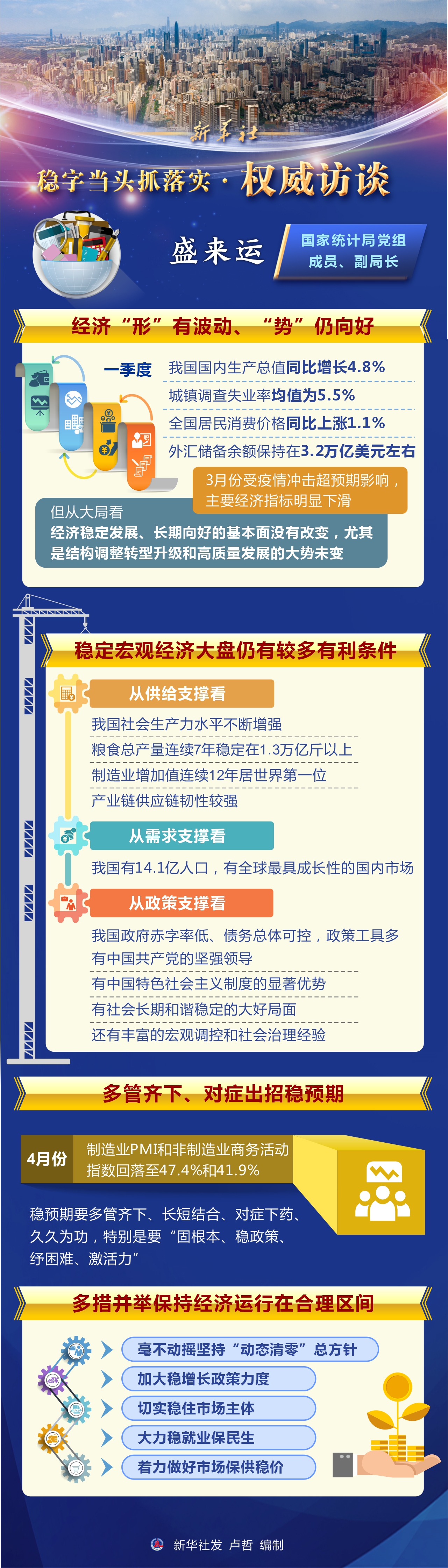 当前经济形势怎么看?宏观经济大盘能否稳得住?如何确保经济运行保持在合理区间?国家统计局党组成员、副局长盛来运接受了新华社记者采访。
