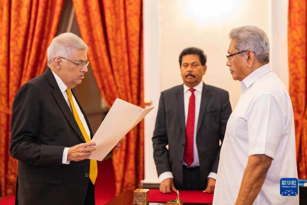 5月12日,在斯里兰卡首都科伦坡的总统官邸,维克勒马辛哈(左)向总统戈塔巴雅·拉贾帕克萨(右)宣誓出任总理。新华社发(斯里兰卡总统府供图)