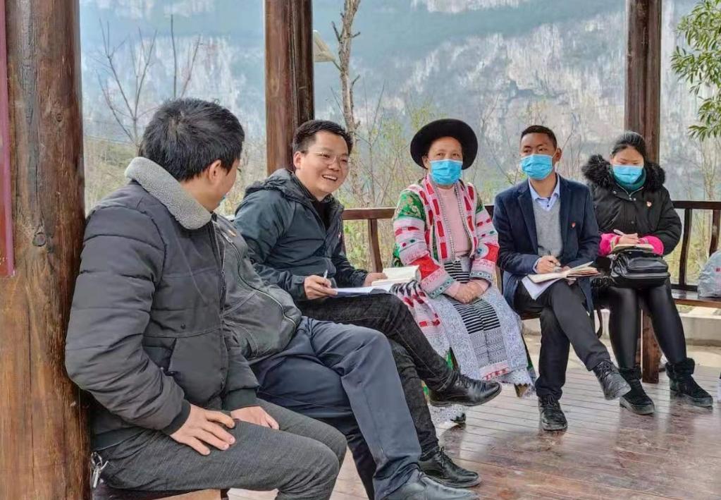 成长为贵州省黔西市洪水镇干部的“90后”西部计划志愿者丁西龙(右四)了解群众生产生活情况。(受访者供图)