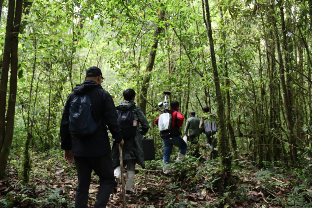 图为测量团队进入森林腹地进行实地测量。(受访者供图)