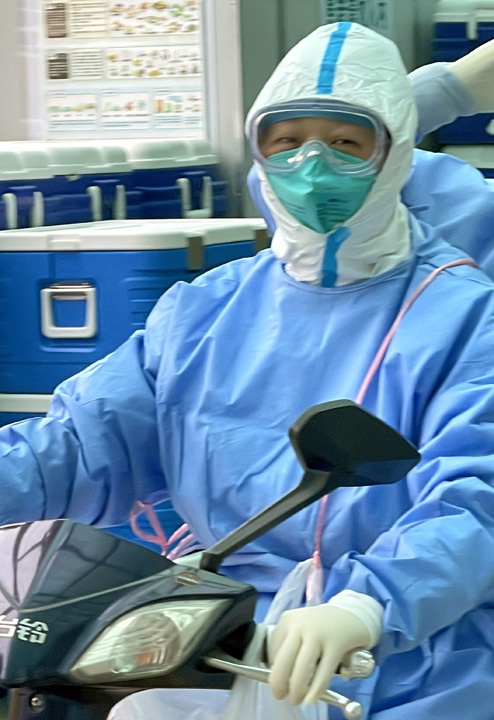 李培蕾骑电动车去社区开展核酸采样。(受访者供图)
