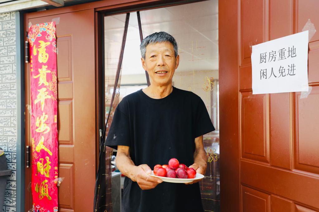 林场退休职工刘养顺在农家乐招待客人(2021年7月22日摄)。新华社记者孙晓宇 摄