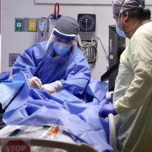 2021年1月22日,在美国加利福尼亚州蒙特贝洛市贝弗利医院,医护人员在新冠病区治疗病人。(新华社发)