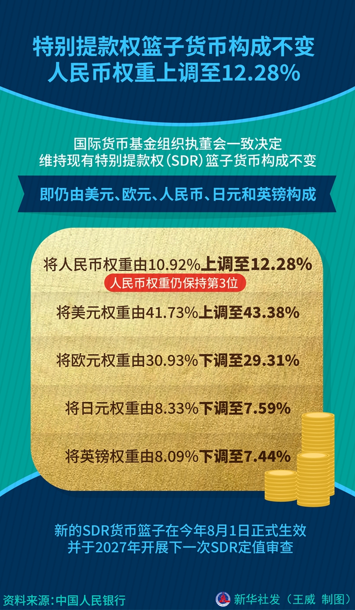 记者5月15日从中国人民银行获悉,国际货币基金组织执董会一致决定,维持现有特别提款权(SDR)篮子货币构成不变,并将人民币权重由10.92%上调至12.28%。新的SDR货币篮子在今年8月1日正式生效,并于2027年开展下一次SDR定值审查。