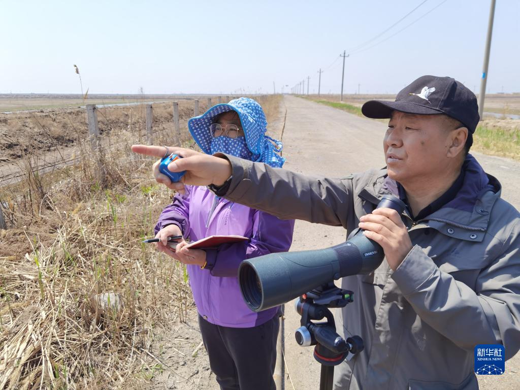 4月29日,盘锦市林业和湿地保护服务中心主任李玉祥(右)和同事在观察黑嘴鸥数量。新华社发
